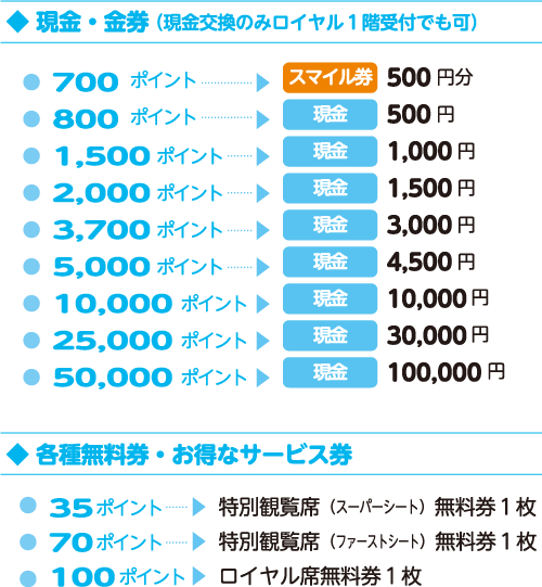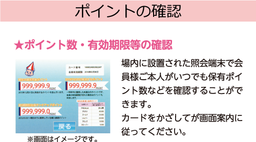開催日の場内インフォメーションで受け付けています。 また、所有ポイント数や有効期限は場内の「照会端末」で確認できます。