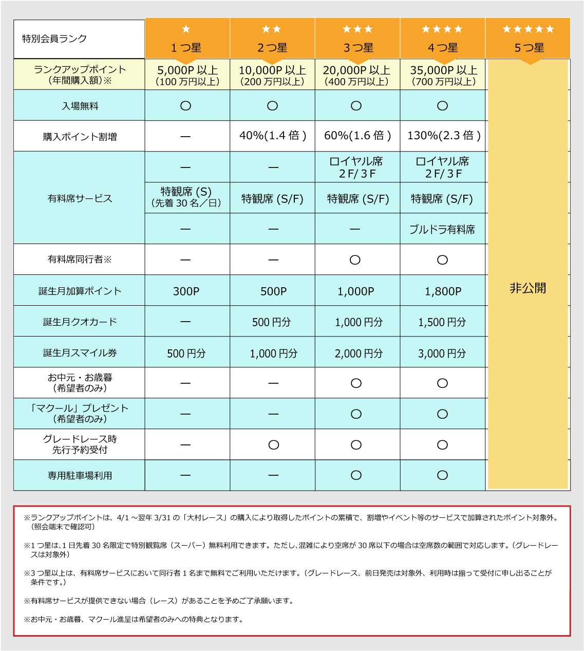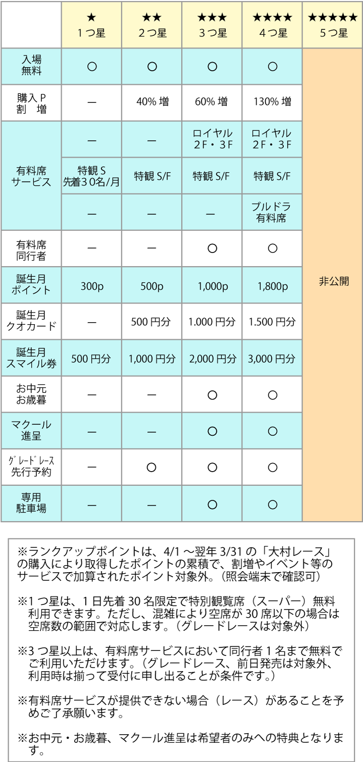 4月1日から翌年3月31日までの「大村レース」の年間購入額(ランクアップポイント)に応じて特別会員ランクを設け、それぞれにお得な特典を用意しています。
