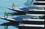 水面のスタートライン0秒付近の発走台には大時計と信号灯、チェッカー灯が設置されています。大時計の文字板は直径約3m。黒の艶消し塗装で1分針は白色、12秒針は黄色(蛍光)であることが基準。観客側からは見えない信号灯とチェッカー灯は、F1レースなどでお馴染みのように、選手にスタートの瞬間や、最終周回を知らせたり、失格や競技中止などを知らせます。
