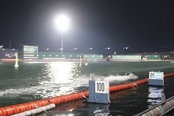 水面のスタートライン0秒付近の発走台には大時計と信号灯、チェッカー灯が設置されています。大時計の文字板は直径約3m。黒の艶消し塗装で1分針は白色、12秒針は黄色(蛍光)であることが基準。観客側からは見えない信号灯とチェッカー灯は、F1レースなどでお馴染みのように、選手にスタートの瞬間や、最終周回を知らせたり、失格や競技中止などを知らせます。